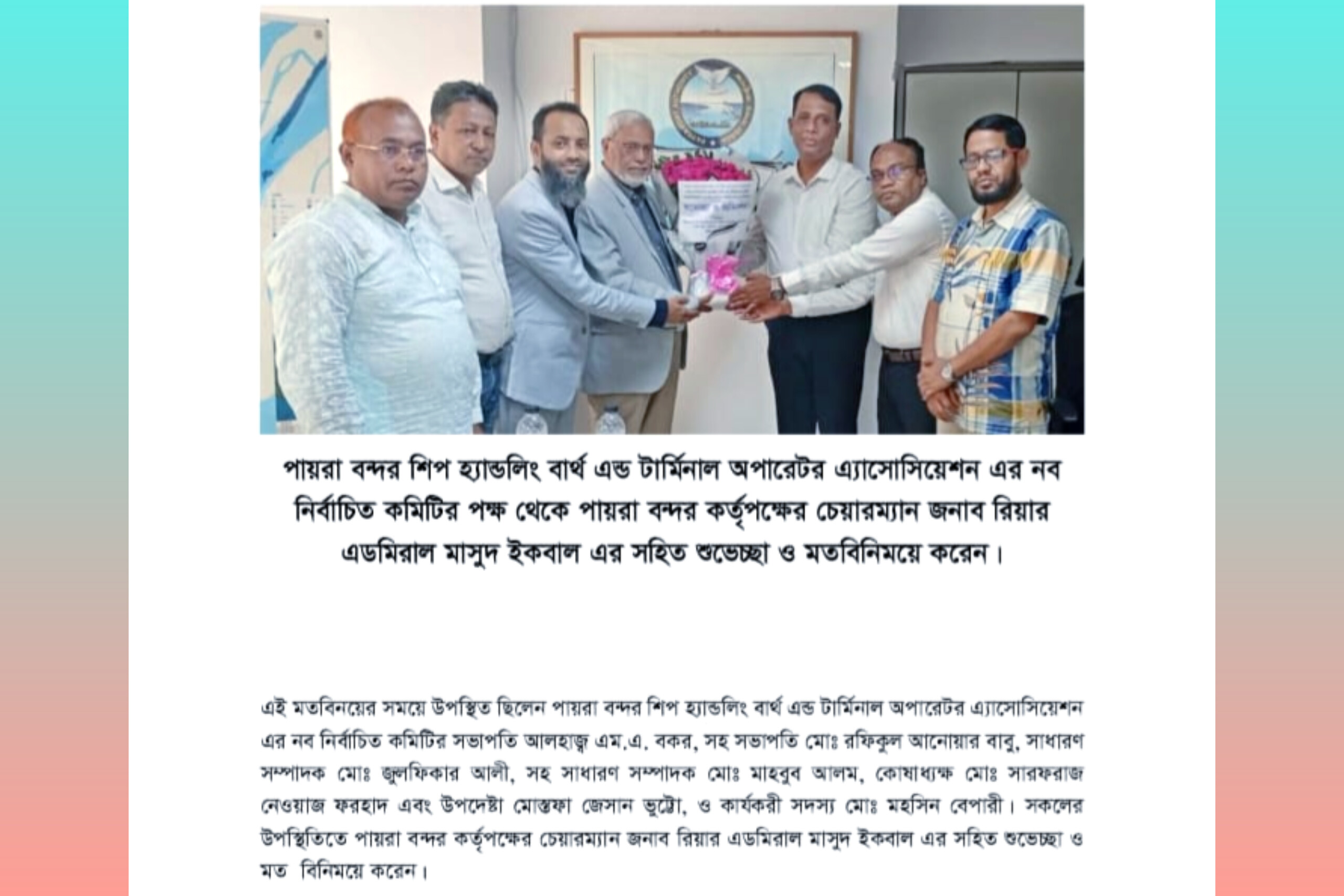 পায়রা বন্দর শিপ হ্যান্ডলিং বার্থ অ্যান্ড টার্মিনাল অপারেটর অ্যাসোসিয়েশনের নবনির্বাচিত কমিটির পক্ষ থেকে পায়রা বন্দর কর্তৃপক্ষের চেয়ারম্যান রিয়ার অ্যাডমিরাল মাসুদ