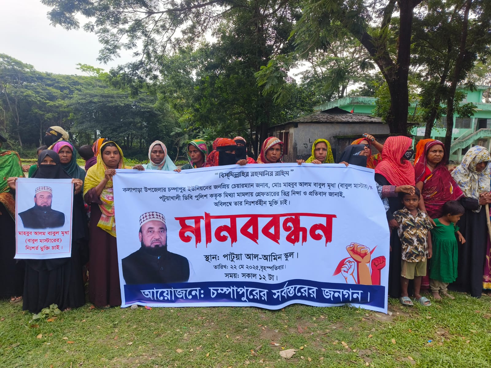চম্পাপুর ইউনিয়ন পরিষদ চেয়ারম্যান ও পাটুয়া আল-আমিন মাধ্যমিক বিদ্যালয়ের প্রধান শিক্ষক মাহবুবুল আলম বাবুলের মুক্তির দাবিতে পটুয়াখালীর কলাপাড়ায় মানববন্ধন অনুষ্ঠিত