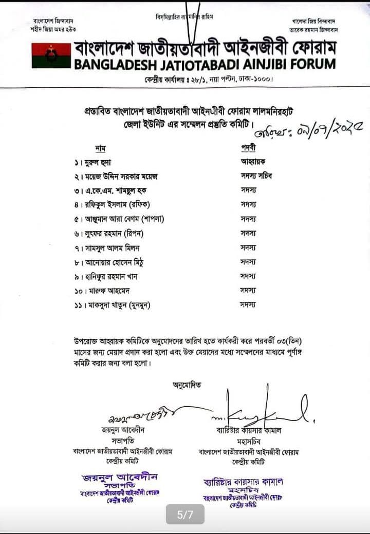 প্রস্তাবিত বাংলাদেশ জাতীয়তাবাদী আইনজীবী ফোরাম লালমনিরহাট জেলা ইউনিট এর সম্মেলন প্রস্তুতি আহবায়ক কমিটির অনুমোদন দেওয়া হয়েছে। বুধবার (৯ জুলাই) বাংলাদেশ