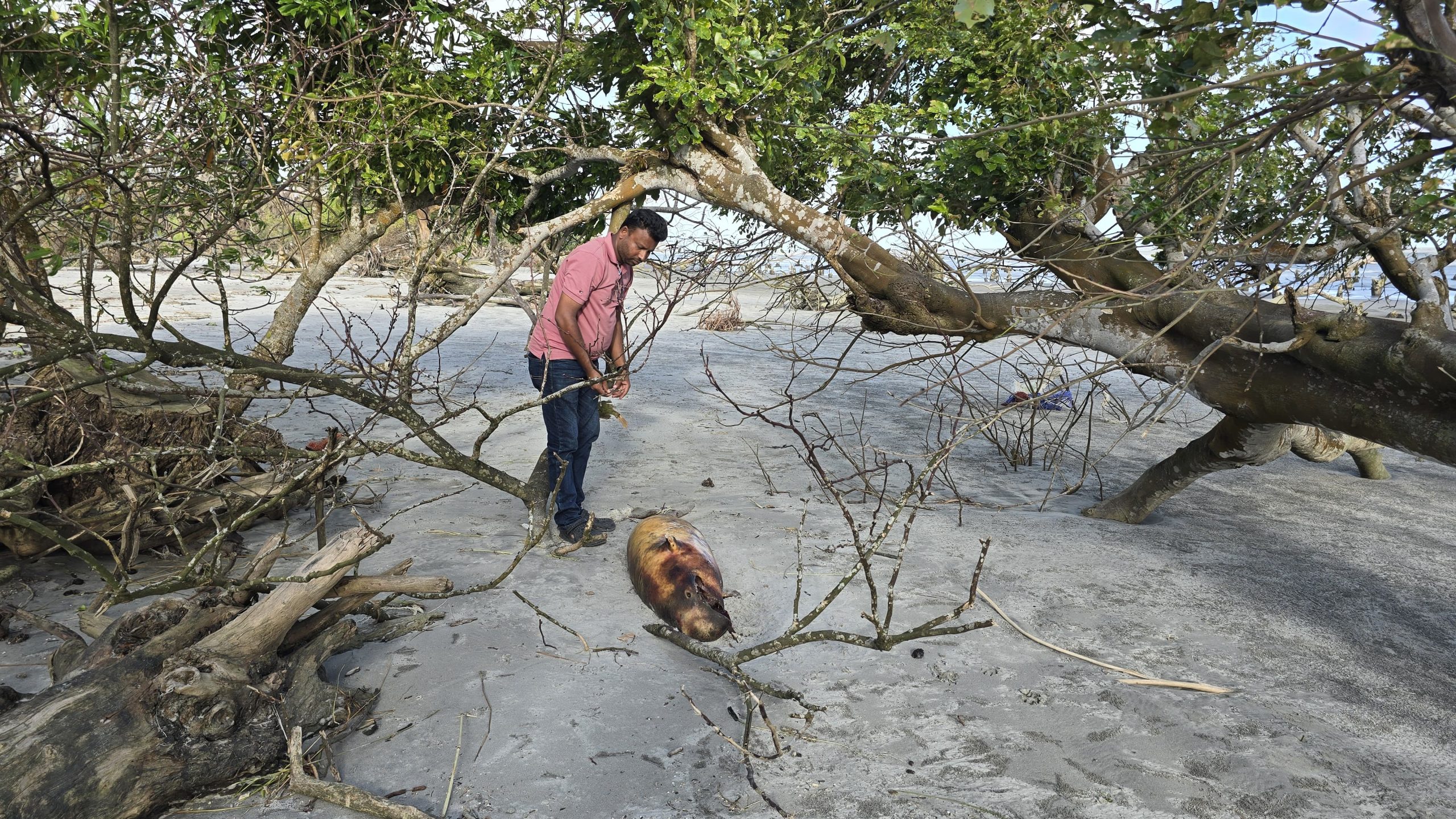 পটুয়াখালীর কুয়াকাটা সৈকতে ১০ ফুট লম্বা একটি ইরবতি ডলফিন ভেসে এসেছে। এটির পুরো মাথা এবং শরীরের বিভিন্ন অংশে চামড়া উঠানো।