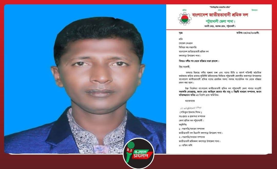 দলীয় শৃঙ্খলা ভঙ্গ, কলাপাড়া শ্রমিক দল নেতা সোহেল দেওয়ানকে বহিষ্কার