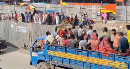 বাস না পেয়ে ট্রাক-পিকআপে ঢাকায় ফিরছে মানুষ।