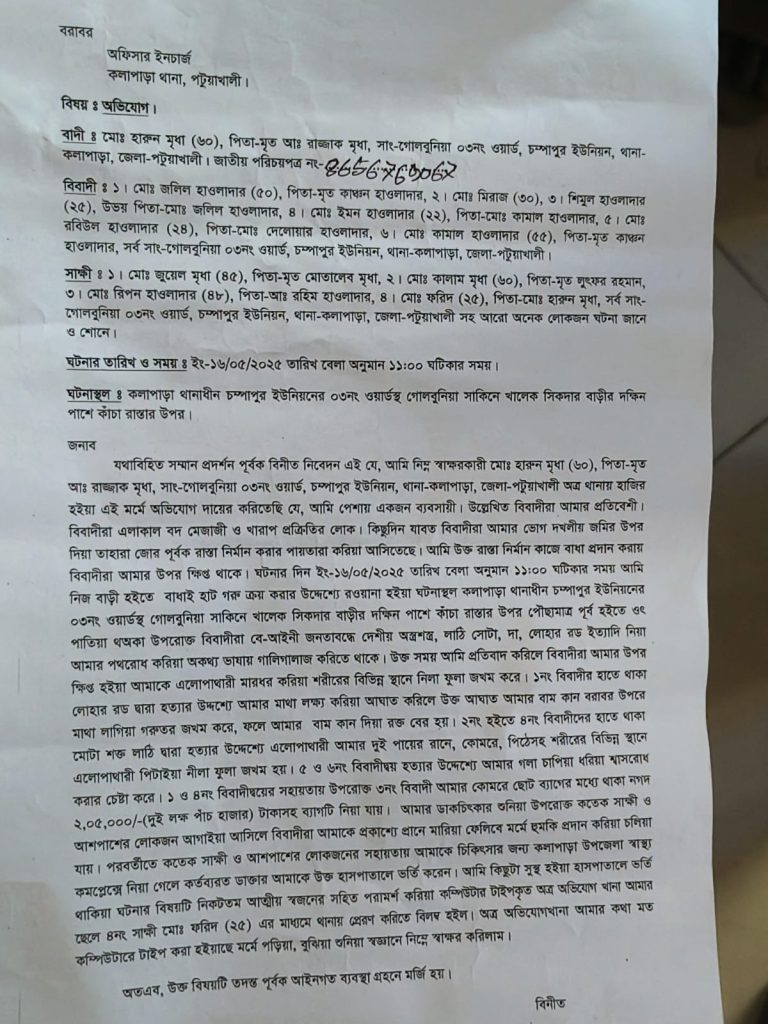 আহত হারুন জানায়, তিনি পেশায় একজন মুদিমনোহরী ব্যবসায়ী। দীর্ঘদিন ধরে একই এলাকার জলিল হাওলাদার, মিরাজ, শিমুল হাওলাদার, ইমন হাওলাদার, রবিউল ও কামাল হাওলাদার তার নিজ ভোগ দখলীয় জমি দখল করে রাস্তা নির্মান করার পায়তারা চালায়। সকালে অভিযুক্তরা তার জমিতে রাস্তা নির্মানের লক্ষে মাটি কাটার কাজ শুরু করে। পরে তিনি মাটি কাটার কাজে বাঁধা প্রদান করেন। বেলা এগারোটায় হারুন কোরবানীর গরু কেনার উদ্দেশ্যে নিজ বাড়ি থেকে বাধাই হাট বাজারের উদ্দেশ্যে রওনা দেন। এসময় সে ওই গ্রামের খালেক শিকদার বাড়ির দক্ষিন পাশের কাঁচা রাস্তার উপর পৌছলে আগে থেকে ওৎ পেতে থাকা অভিযুক্তরা পথ রোধ করে গালিগালাজ শুরু করে। পরে সে প্রতিবাদ করলে অভিযুক্তরা দেশীয় লাঠি-সোঠা ও লোহার রড দিয়ে তাকে এলোপাথাড়ি মারধর শুরু করে। এতে তার শরীরের বিভিন্ন স্থানে নীলা ফুলা জখম হয়। এসময় তার ডাকচিৎকারে স্থানীয়রা এগিয়ে আসলে তারা তাকে মেরে ফেলার হুমকি দিয়ে চলে যায়। মারধরে সময় অভিযুক্তরা তার সঙ্গে ছোট ব্যাগের মধ্যে থাকা দুই লাখ পাঁচ হাজার টাকা নিয়ে যায়।