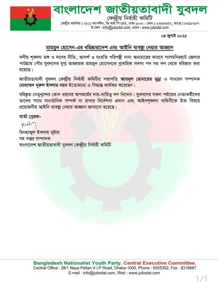 প্রেস বিজ্ঞপ্তিতে বলা হয়, দলীয় শৃঙ্খলা ভঙ্গ ও দলের নীতি, আদর্শ ও সংহতি পরিপন্থী নানা অনাচারের কারণে লালমনিরহাট জেলার পাটগ্রাম পৌর যুবদলের যুগ্ম আহ্বায়ক মাহমুদ হোসেনকে প্রাথমিক সদস্য পদ সহ দল থেকে বহিষ্কার করা হয়েছে। জাতীয়তাবাদী যুবদল কেন্দ্রীয় নির্বাহী কমিটির সভাপতি আবদুল মোনায়েম মুন্না ও সাধারণ সম্পাদক মোহাম্মদ নূরুল ইসলাম নয়ন ইতোমধ্যে এ সিদ্ধান্ত কার্যকর করেছেন। বহিষ্কৃত নেতৃবৃন্দের কোন ধরনের অপকর্মের দায়-দায়িত্ব দল নিবেনা। যুবদলের সকল পর্যায়ের নেতাকর্মীদের তাদের সাথে সাংগঠনিক সম্পর্ক না রাখার নির্দেশনা প্রদান এবং আইনশৃঙ্খলা বাহিনীকে উক্ত বিষয়ে প্রয়োজনীয় আইনি ব্যবস্থা নেয়ার আহ্বান জানানো হয়েছে।