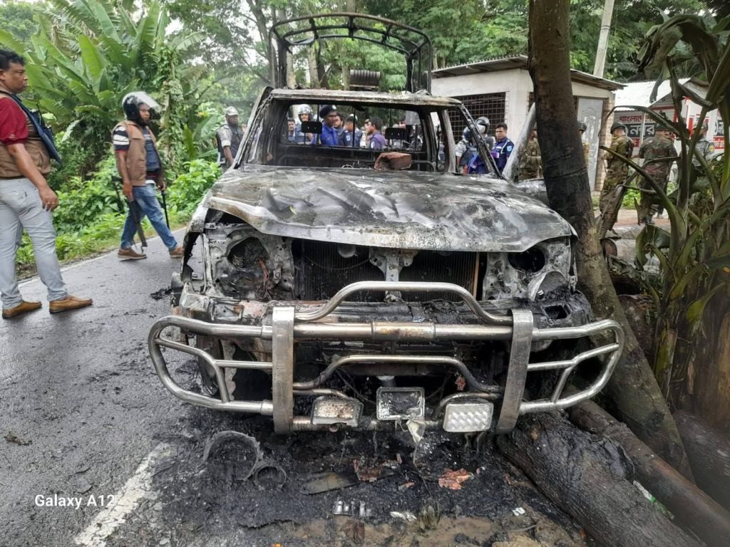 এনসিপির পদযাত্রাকে কেন্দ্র করে গোপালগঞ্জে পুলিশের গাড়িতে আগুন ছাত্রলীগের।